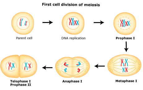 Also at this stage the chromosomes can exchange genetic material in a process called chromosomal crossover. The homologous chromosomes are then pulled apart into two new separate daughter cells, each containing half the number of chromosomes as the parent cell. Thus meiosis I is referred to as a reductional division. At the end of meiosis I, sister chromatids remain attached and may differ from one another if crossing-over occurred.