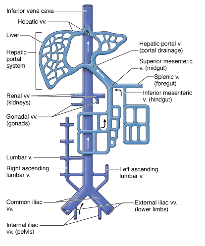 • Portal system. Veins from the foregut, midgut, and hindgut drain blood to the liver before the blood enters the inferior vena cava and ultimately returns to the heart.