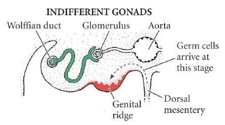 In the fourth week, germ cells begin to migrate from the endoderm lining of the yolk sac to the genital ridges, via the dorsal mesentery of the hindgut. They reach the genital ridges in the sixth week.