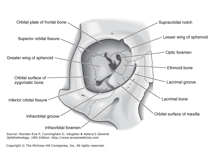 medially by the ethmoid sinus, inferiorly by the maxillary sinus, and laterally by the zygomatic bone. See Figure below. The roof of the orbit is composed principally of the orbital plate of the frontal bone. The ethmoid bone (lamina papyracea) is paper thin and is the most likely sinus wall to break in blunt eye trauma or to be perforated due to sinusitis with subsequent spread of infection to the orbit. The orbital contents include the ocular muscles retroseptal fat and optic nerve, whereas the globe is considered a separate entity.