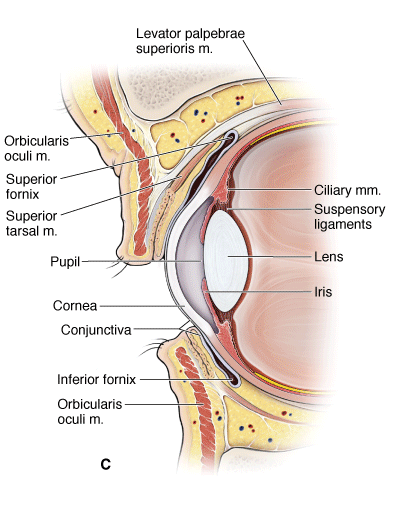 The conjunctiva is a mucous membrane that lines the internal surface of the eyelids. The conjunctiva is reflected at the superior and inferior fornices onto the anterior surface of the eyeball and forms the conjunctival sac when the eyes are closed.