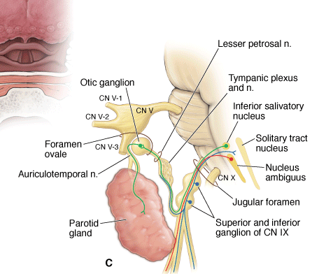 - CN IX gives rise to the lesser petrosal nerve, which exits the middle ear and the skull via the foramen ovale to synapse in the otic ganglion.