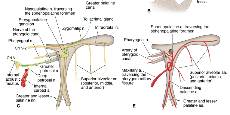 A. Outline of the pterygopalatine fossa. B. Axial section of the pterygopalatine fossa. C. and D. Nerves of the pterygopalatine fossa. E. and F. Arteries of the pterygopalatine fossa.