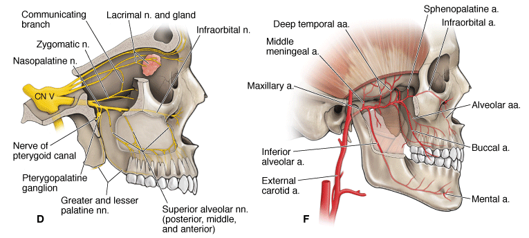 The maxillary artery is a terminal branch of the external carotid artery, courses anteriorly through the infratemporal fossa, traverses the pterygomaxillary fissure, and enters the pterygopalatine fossa (Figure 22-1E and F). The maxillary artery supplies the maxilla, maxillary teeth, and palate before traversing the sphenopalatine foramen to terminate in the nasal cavity. The major branches of the maxillary artery in the pterygopalatine fossa are as follows: