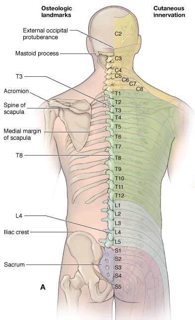 A. Surface anatomy of the back showing bony landmarks on the left and cutaneous nerves on the right. B. Axial section of the back showing the dorsal rami transmitting sensory neurons from the skin of the back to the spinal cord. Normal curvatures of the vertebral column in a newborn (C) and in an adult (D). |