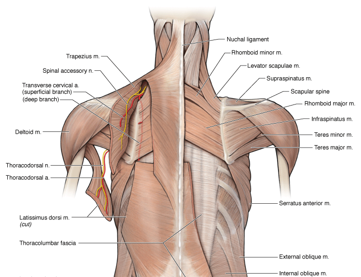 In addition, the multiple fiber orientation of the trapezius muscle fixes the scapula to the posterior wall of the thorax during upper limb movement. It is innervated by the spinal accessory nerve (CN XI). The superficial branch of the transverse cervical artery supplies the trapezius muscle, whereas the deep branch of the transverse cervical artery supplies the levator scapulae and rhomboid muscles. In some instances, the dorsal scapular artery will replace the deep branch of the transverse cervical artery.