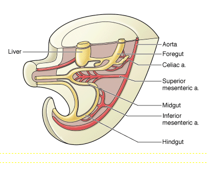 There are three unpaired arterial trunks that arise from the anterior surface of the abdominal aorta respectively for the foregut, midgut and the hindgut. Each receives a primary, but not sole, arterial supply: foregut–celiac trunk, midgut–superior mesenteric artery, and hindgut–inferior mesenteric artery.