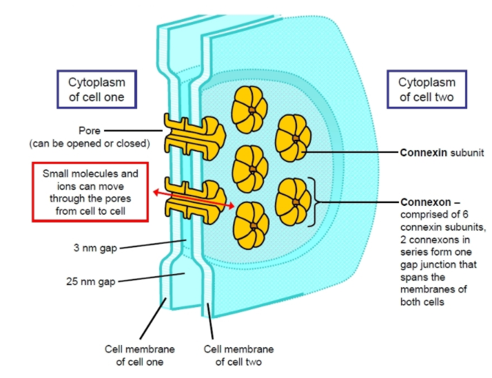 Schematic diagram of a gap junction. One connexon is made from two hemiconnexons. Each hemiconnexon is made from six connexin molecules. Small solutes are able to diffuse through the central channel, providing a direct mechanism of cell–cell communication. One gap junction contains several connexons. Different connexins are found in different tissues.