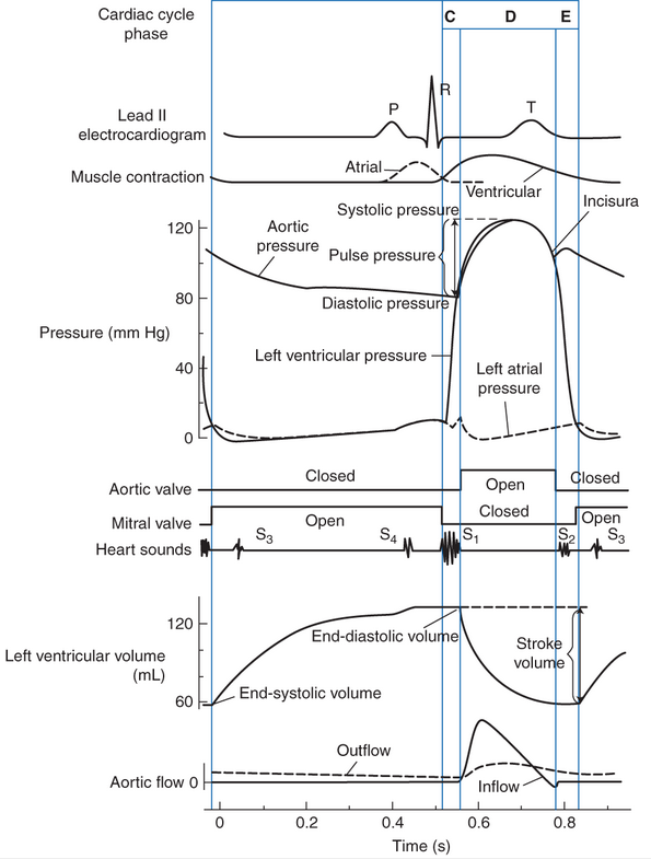 The cardiac cycle diagram shown to the right depicts changes in aortic pressure (AP), left ventricular pressure (LVP), left atrial pressure (LAP), left ventricular volume (LV Vol), and heart sounds during a single cycle of cardiac contraction and relaxation. These changes are related in time to the electrocardiogram. An online video and tutorial of the cardiac cycle from the Health Education Assets Library is available: cardiac cycle video.