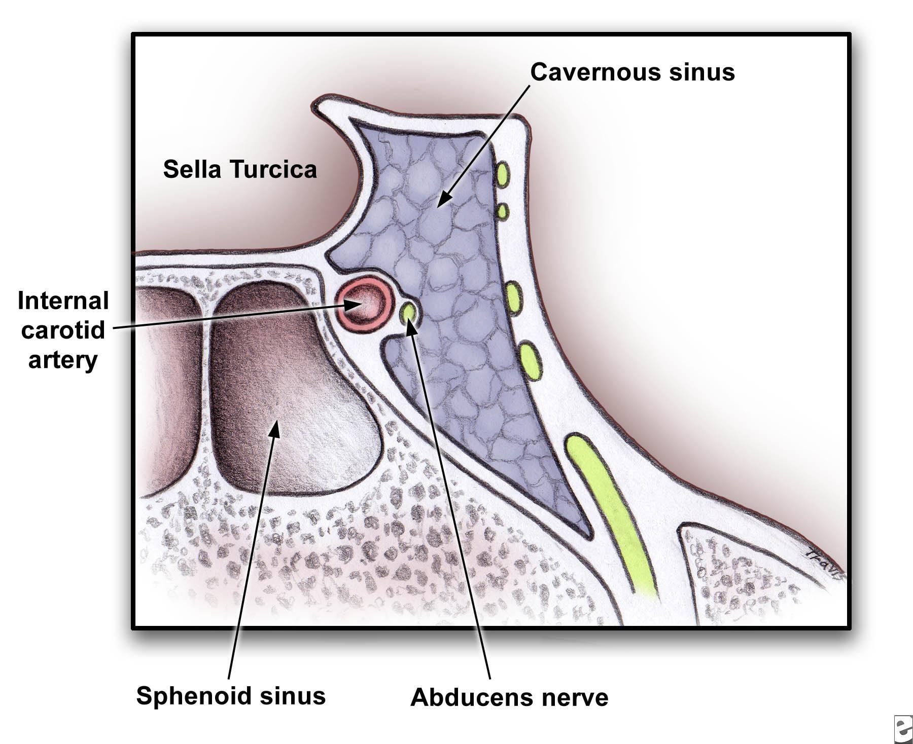 The cavernous sinus is the only location in the body where an artery courses through a venous structure. A carotid-cavernous sinus fistula forms when the internal carotid artery ruptures within the cavernous sinus.