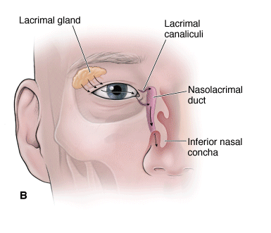 Because the mucosa of the nasal cavity is continuous with the mucosa of the nasolacrimal duct system, a cold or “stuffy” nose often causes the lacrimal mucosa to become inflamed and swollen. Swelling constricts the ducts and prevents tears from draining from the eye surface, causing “watery” eyes.