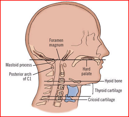 The third cervical vertebra is at the level of the hyoid bone; the fourth and fifth cervical vertebrae are at the level of the thyroid cartilage.