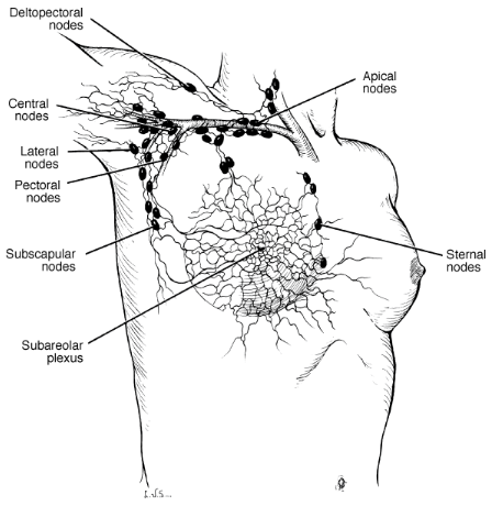 Lymphatics of the breast. (Reproduced, with permission, from Lindner HH. Clinical Anatomy. East Norwalk, CT: Appleton & Lange, 1989:205.)