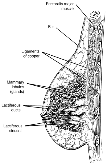 Saggital section of the breast. (Reproduced, with permission, from Lindner HH. Clinical Anatomy. East Norwalk, CT: Appleton & Lange, 1989:202.)