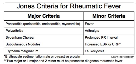 ●The five major manifestations (major Jones Criteria) of ARF are migratory arthritis (predominantly involving the large joints), carditis and valvulitis (eg, pancarditis), central nervous system involvement (eg, Sydenham chorea), erythema marginatum, and subcutaneous nodules. The four minor manifestations (minor Jones Criteria) are arthralgia, fever, elevated acute phase reactants, and prolonged PR interval on electrocardiogram. (See 'Acute illness' above.)
